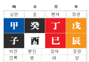 | 일간 | 갑(甲) | 을(乙) | 병(丙) | 정(丁) | 무(戊) | 기(己) | 경(庚) | 신(辛) | 임(壬) | 계(癸) |