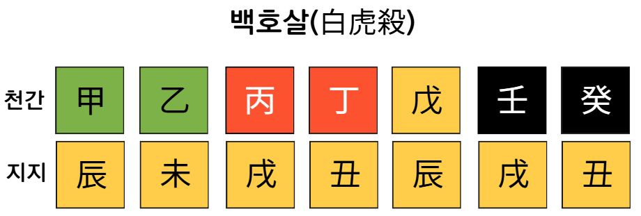 백호(白虎)는 횡액과 급사, 질병과 생사를 주관하는 영물입니다. 만약 일주에 백호살이 있는 경우 배우자의 살성으로 해석될 수 있으며, 배우자가 질병이 있거나 횡액을 당할 수 있고, 원만한 결혼 생활이 어려울 수 있습니다.