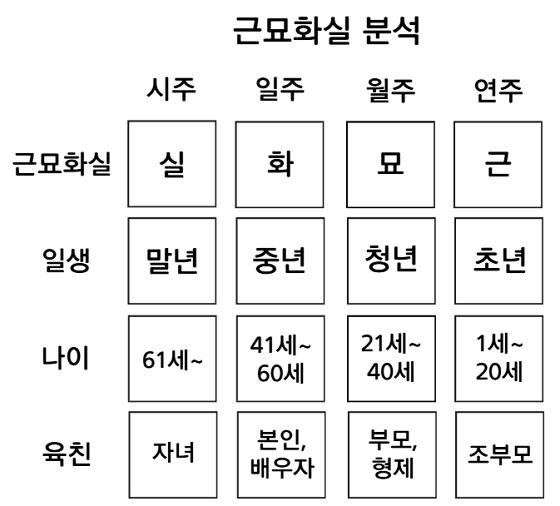 즉, 자신이 태어난 생년, 생월, 생일, 생시를 `근`, `묘`, `화`, `실`로 대응시켜