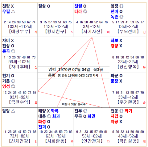 사주 명리학은 태어난 양력 연, 월, 일, 시간을 만세력을 통해 사주팔자를 찾고 각 글자의 음양오행의 생극제화를 가지고 운명에 미치는 영향을 보는 학문이라고 한다면, 자미두수는 음력 연, 월, 일, 시간에 따른 성(星)들의 배치와 상황을 가지고 운명에 미치는 영향을 보는 학문이라 할 수 있습니다.