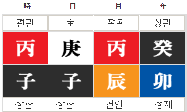 위 그림은 사주팔자의 예시이다. 우측부터 좌측으로 연월일시의 시간흐름을 가지며,