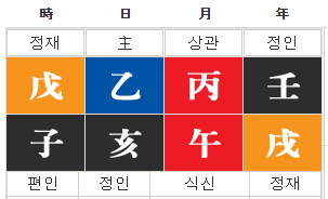 예를 들어 위의 사주팔자를 보면 일간은 을목(乙木)이고 월지(월령)는 오화(午火)로 육신으로 보면 식신이 된다.