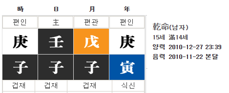 사주로 예를 들어 아래 처럼 2010년 12월 27일 오후 23시 39분에 출생한 남자의 사주가 야자시를 적용하지 않을 경우 임자일에 태어난 것으로 본다.