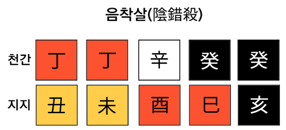 - 음착살(陰錯殺): 여자에게 주로 작용하는 신살로 정축(丁丑), 정미(丁未), 신유(辛酉), 계사(癸巳), 계해(癸亥)로 구성됩니다.
