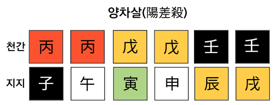 - 양차살(陽差殺): 주로 남자에게 적용되며 병자(丙子), 병오(丙午), 무인(戊寅), 무신(戊申), 임진(壬辰), 임술(壬戌)로 구성됩니다.