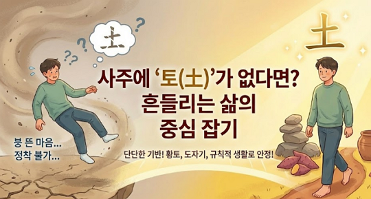 토 기운이 없다는 것은 내가 서 있을 '땅'이 없다는 뜻입니다. 인위적으로 흙의 기운을 가까이하고, 삶의 패턴을 규칙적으로 만드는 것이 최고의 개운법입니다.