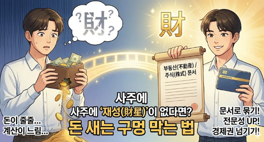 무재 사주의 돈은 '유동성'이 있으면 사라집니다. 돈이 생기는 즉시 땅, 아파트, 건물 같은 부동산이나 장기 적금, 연금, 우량주 등에 묶어두어야 합니다. "내 수중에 현금이 없어야 돈이 모인다"는 말을 명심하세요. 쉽게 현금화할 수 없는 자산으로 바꾸는 것이 무재 사주 최고의 재테크입니다.