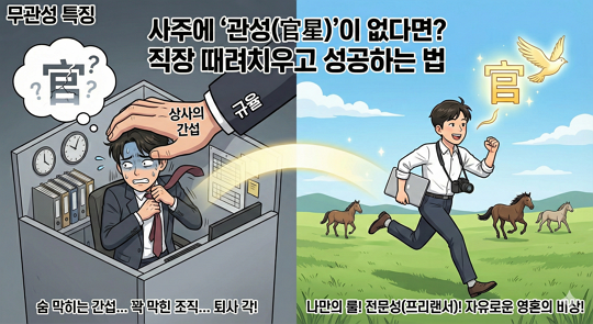 일반 사무직은 무관 사주에게 감옥일 수 있습니다. 간섭받지 않는 의사나 변호사, 엔지니어 같은 전문직이나 예체능, 프리랜서, 유튜버처럼 내 실력만 있으면 터치받지 않는 직업을 선택해야 합니다. "내가 곧 브랜드"가 되는 삶을 살아야 직업운이 풀립니다.